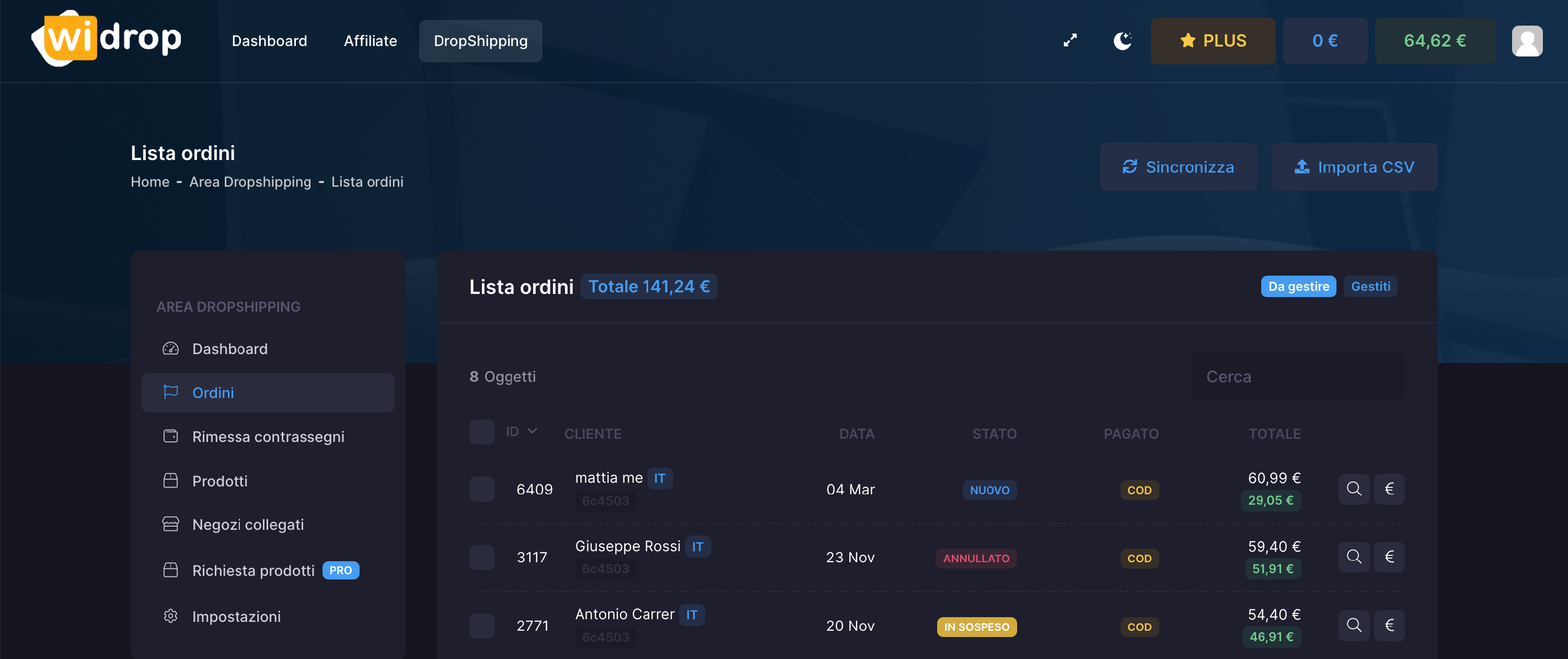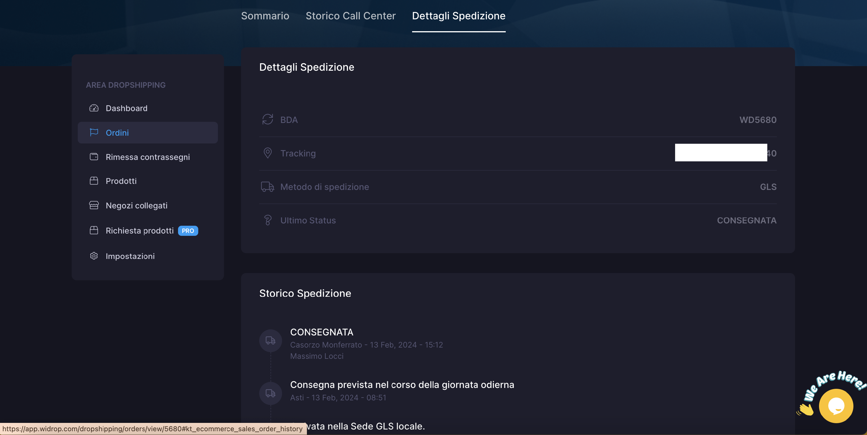 - Nel caso in cui l'ordine sia prepaid (quindi carta), widrop manderà immediatamente l'ordine in spedizione (previa disponibilità di denaro nel wallet di widrop)