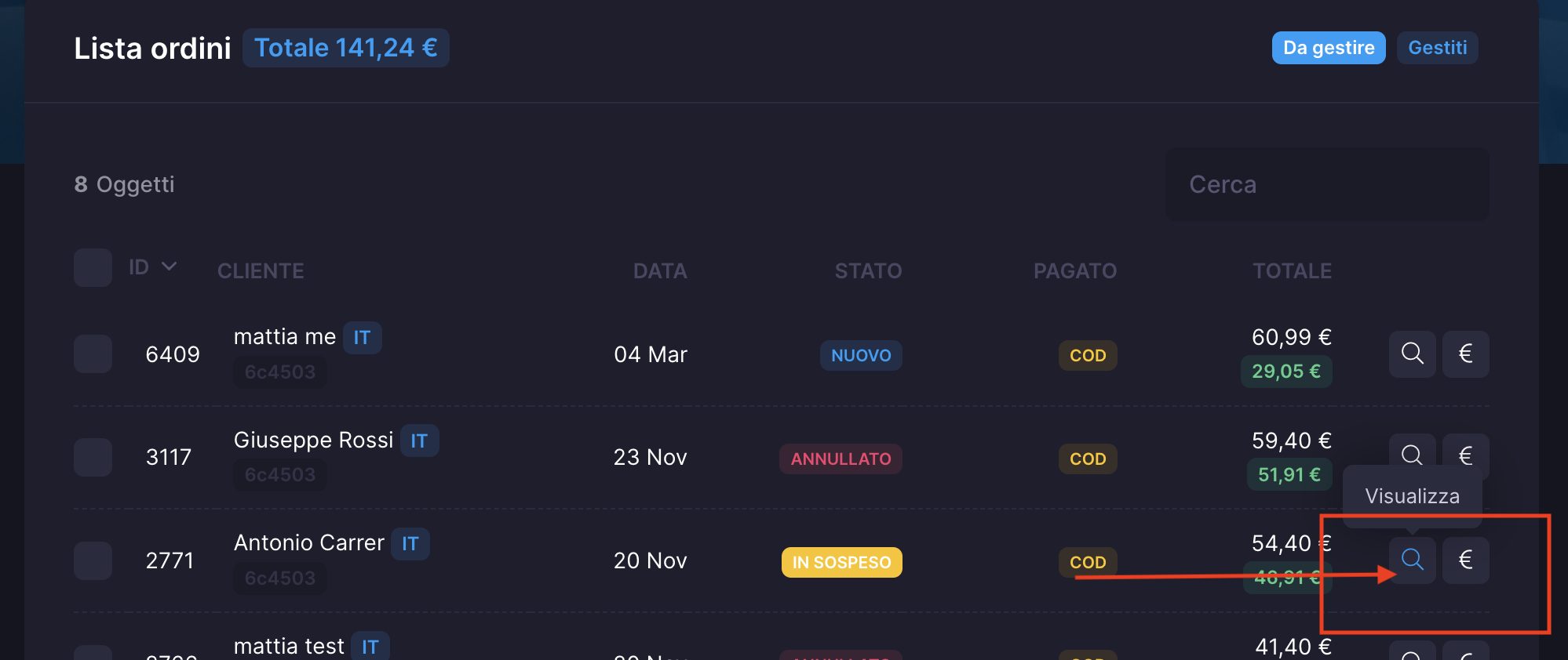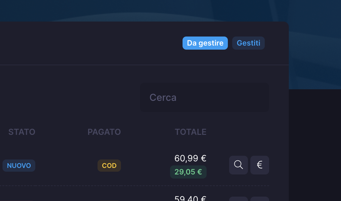 All'interno della sezione ordini potrai gestire gli ordini e visionarli nelle schede "Da gestire" e "Gestiti" poste in alto a destra :