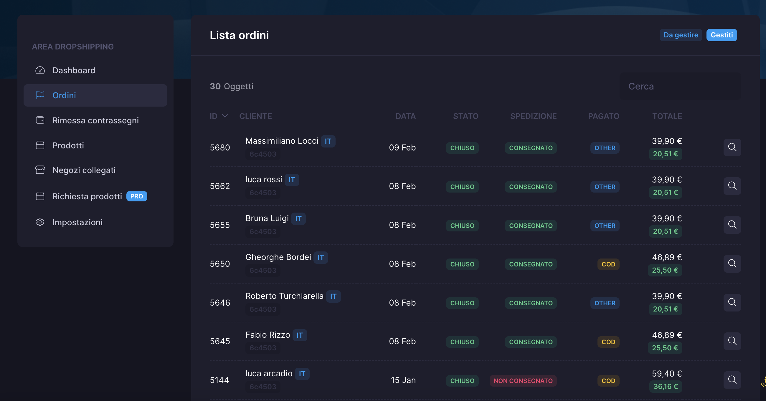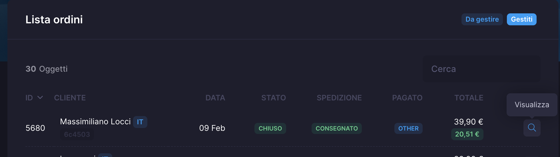 All'interno della scheda Ordini Gestiti , potrai vedere tutti gli ordini che sono stati gestiti e spediti a casa del cliente, ecco la visualizzazione della scheda :