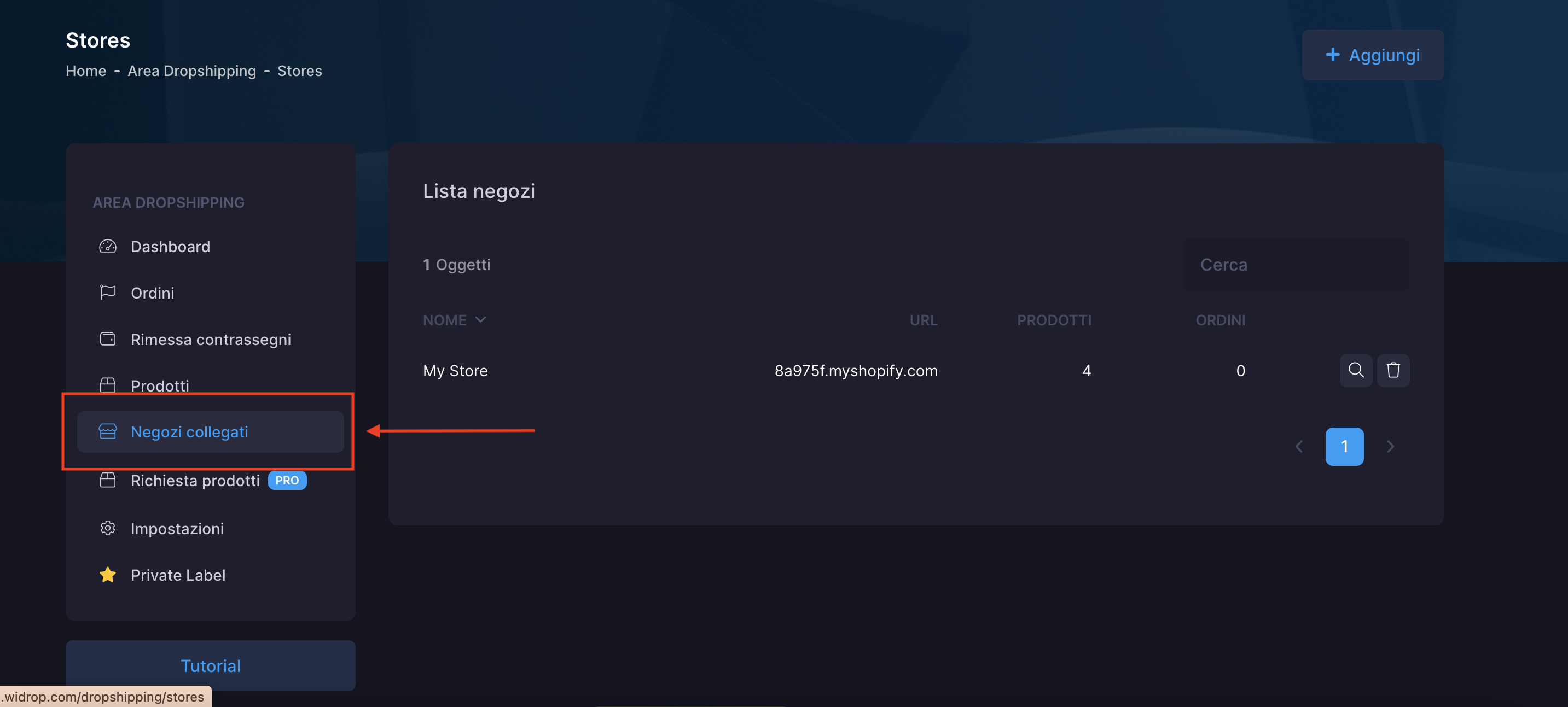 All'interno della voce "Negozi collegati" come prossimo passaggio, bisognerà cliccare sul bottone "Aggiungi" posto in alto a destra.
