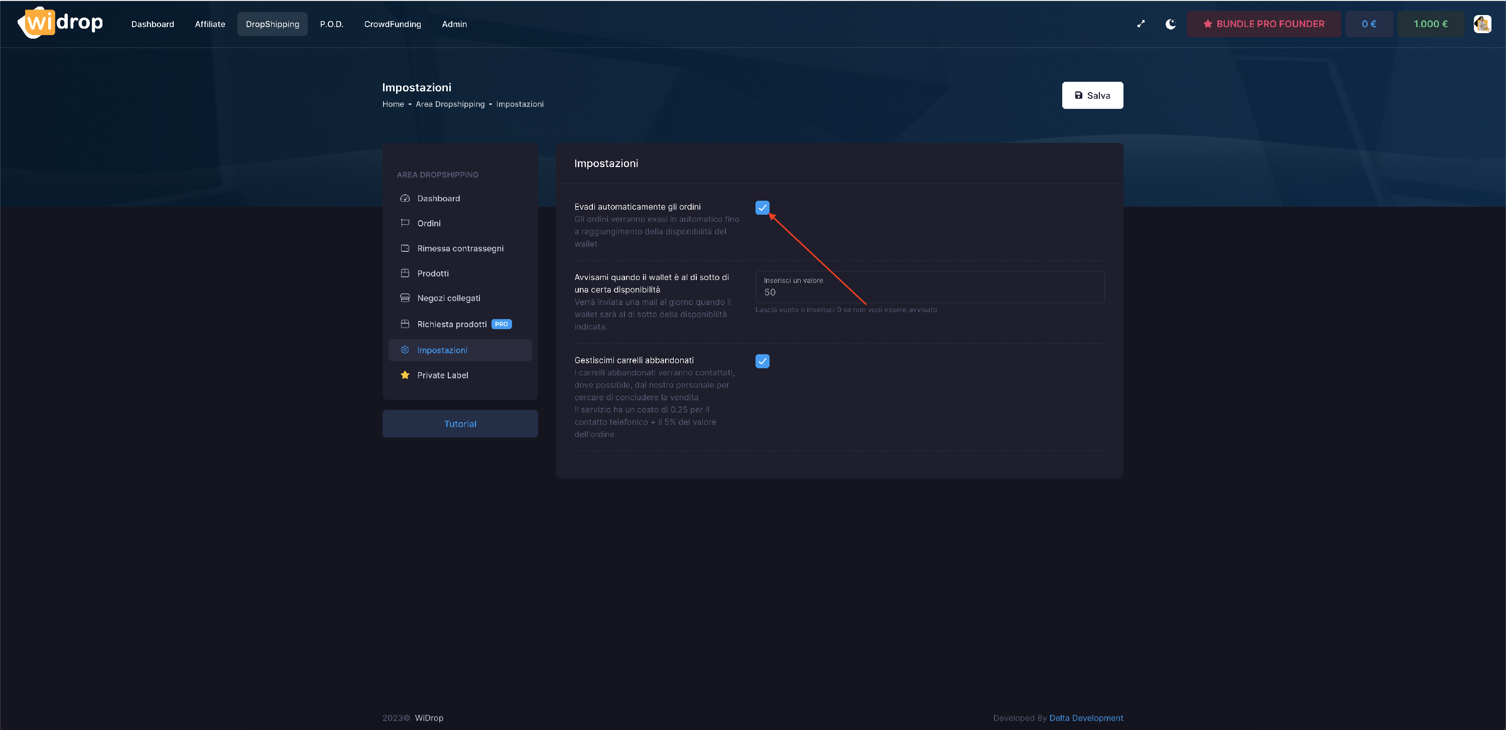 3. Ora attiva la voce "Evadi automaticamente gli ordini" cliccando sul check presente sulla destra, la funzione è attivo se il check è Blu