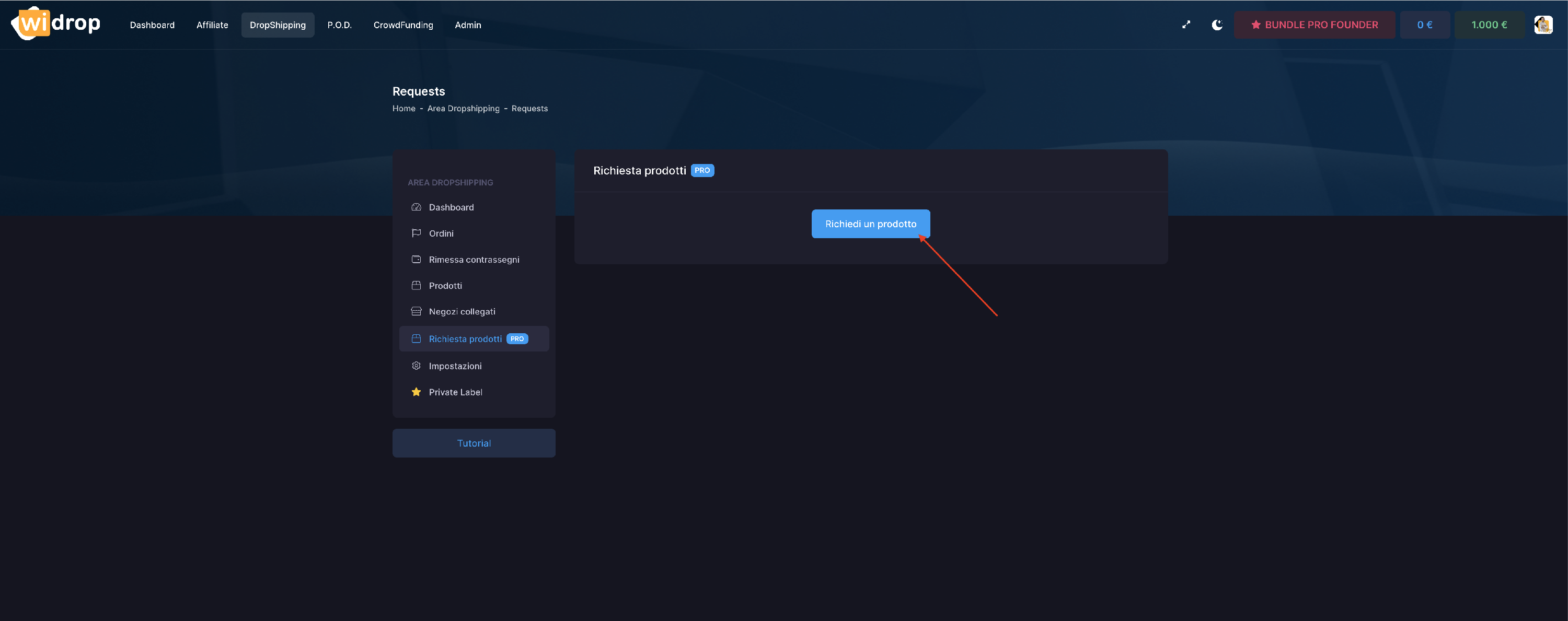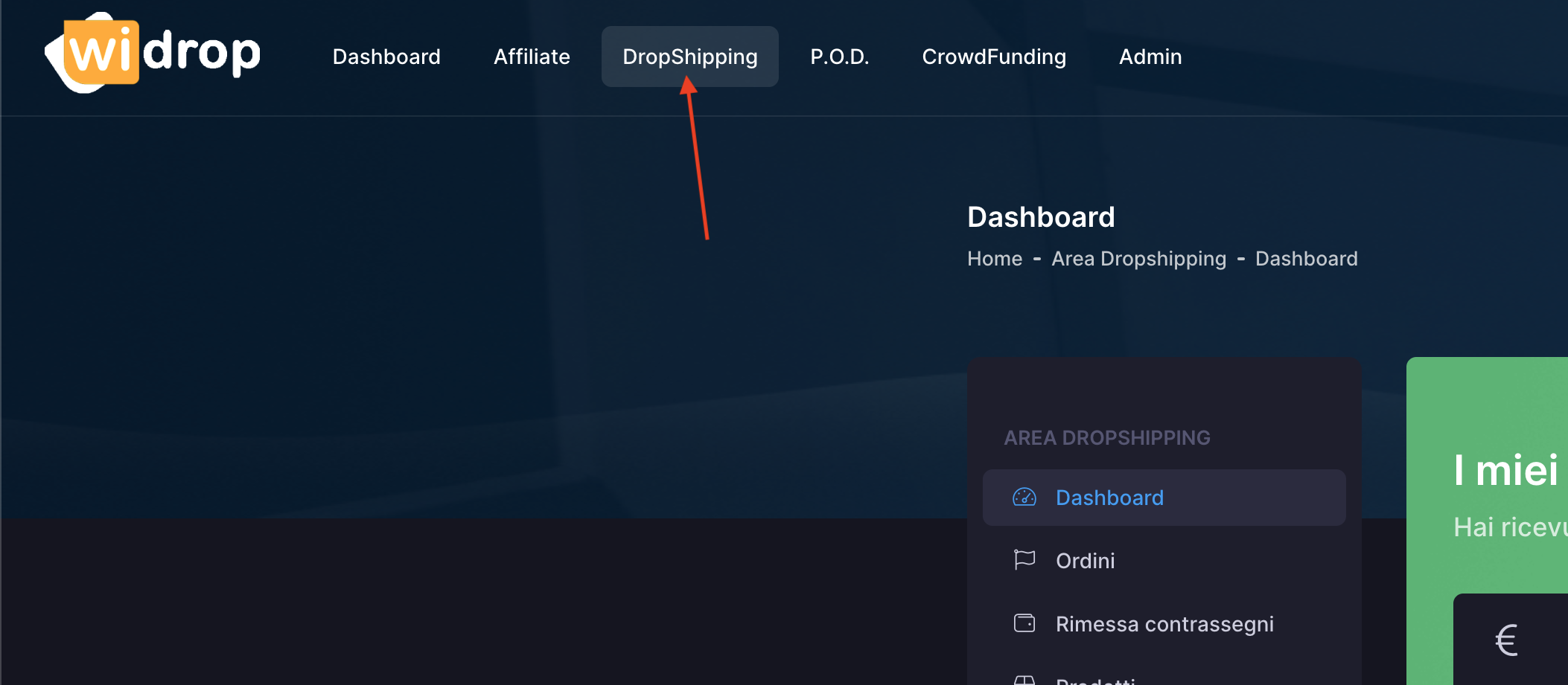 1. Per richiedere il prodotto in widrop Dropshipping entra nella sezione Dropshipping