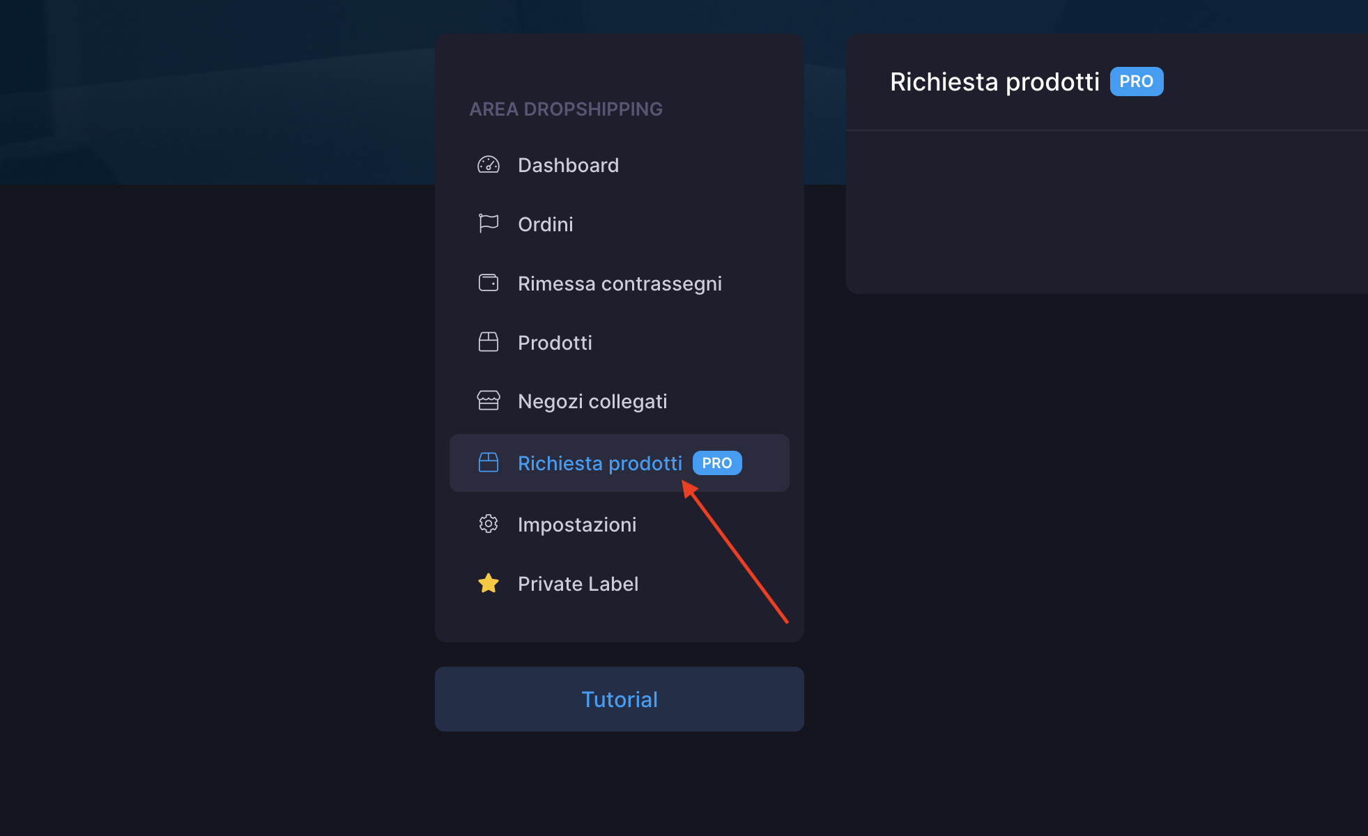 2. Nella colonna posta alla tua destra seleziona la voce "Richiesta prodotti" (Nota bene, la richiesta prodotto potrebbe essere limitata a seconda del piano attivato)